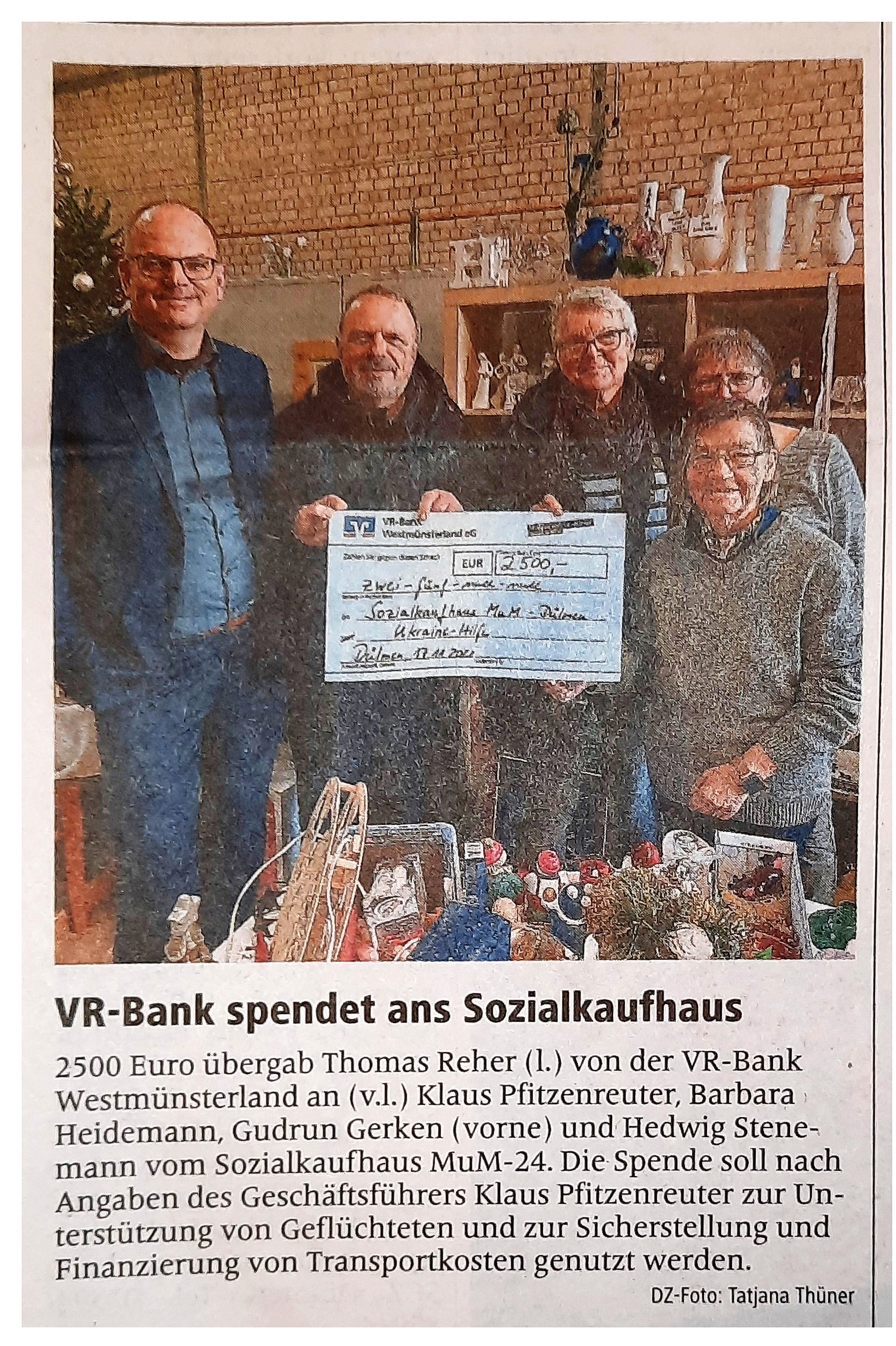 VR-Bank spendet ans Sozalkaufhaus 21 Nov 2022 Von G.Jaeschke Bericht der DZ vom 21.11.2022 Weiterlesen … VR-Bank spendet ans Sozalkaufhaus